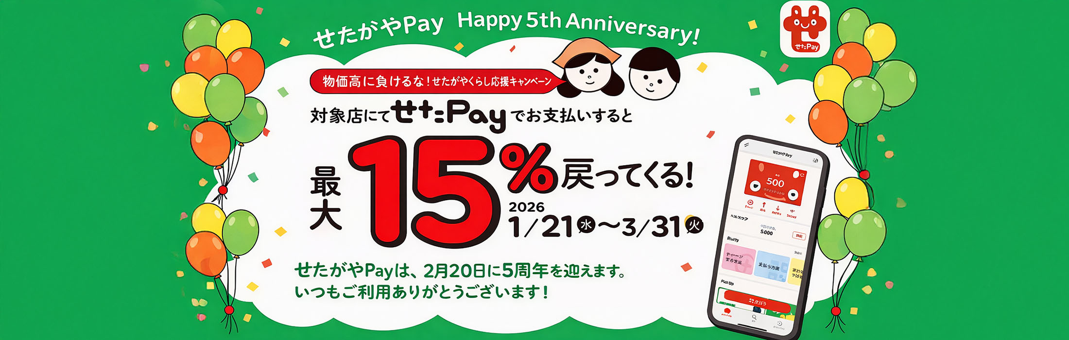 「せたPay」でお支払いいただくと、15%ポイント還元!! ※ポイント還元はコイン(現金でチャージした分)でのお支払いが対象です。ポイントでのお支払いは対象となりません。 【期間】 令和8年1月21日 ...