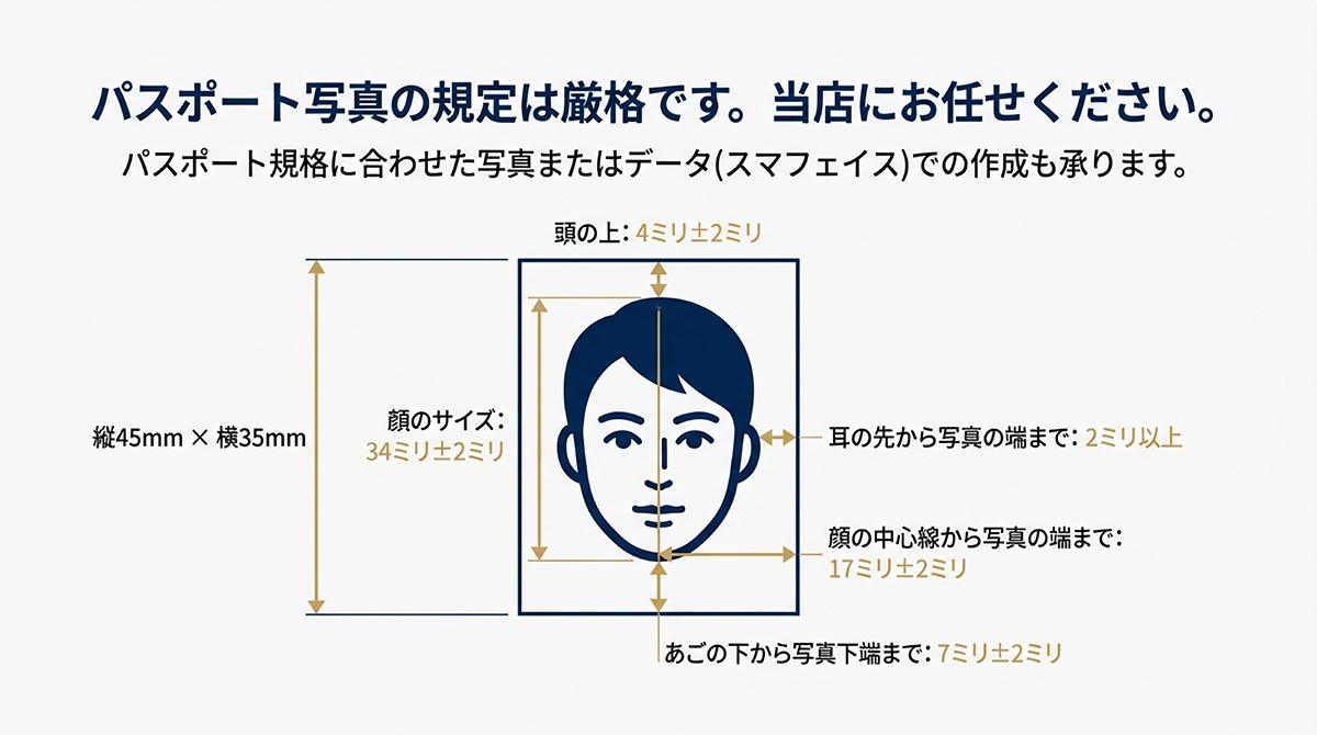 通常の証明写真よりもっとキレイに!! 目の下のくまや口角の修整、ニキビ・傷・シワの除去など自然なレタッチを加えます